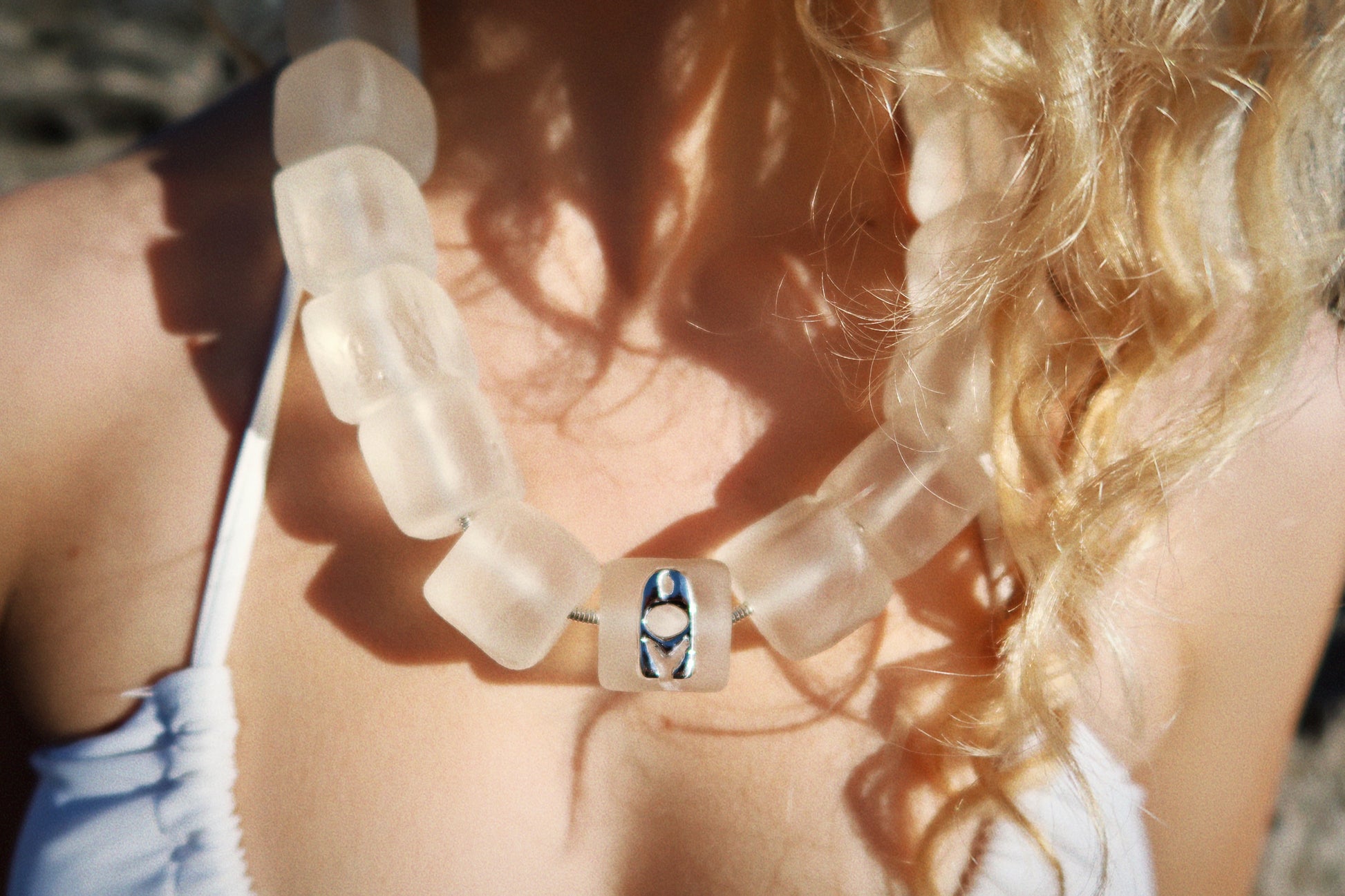 Resin ice cube necklace with stainless steel logo, 100% recycled silver snake chain and lobster claps.